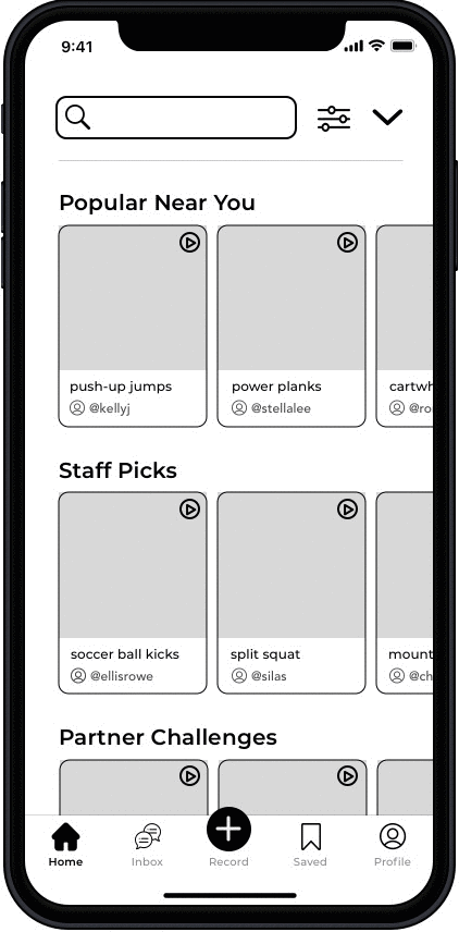 Takes inventory of users’ available tools & space to suggests quick workout videos which they can follow alone or send as challenge recordings to friends.