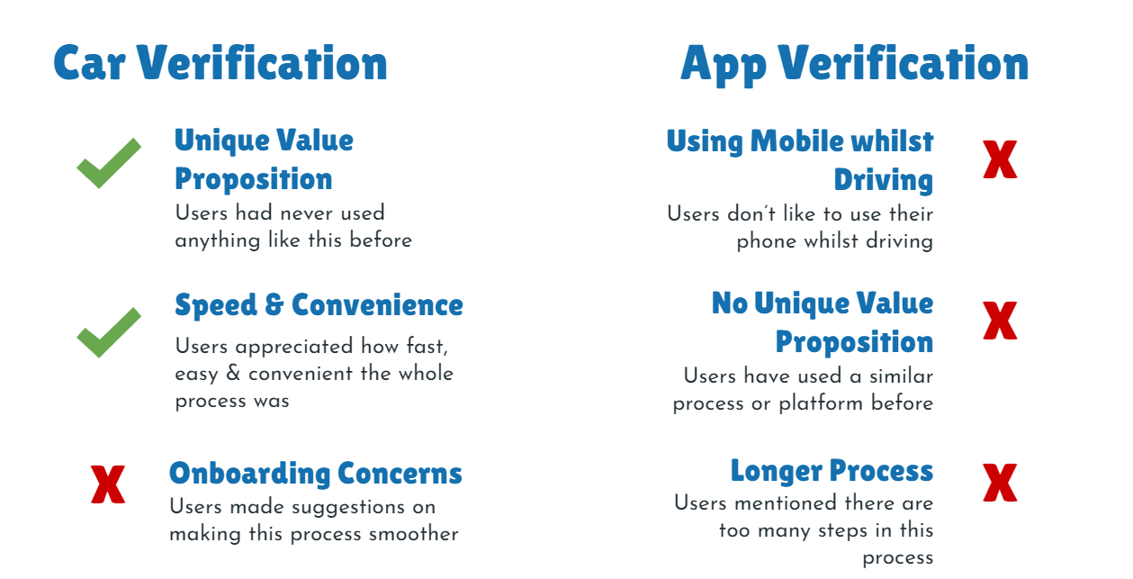 Through the remote usability testing using test case scenarios as well as an obstacle course we found that the car verification process was the perfect solution and very much preferred by the users! We were so excited to present this to the client and expected them to be as excited as we were.